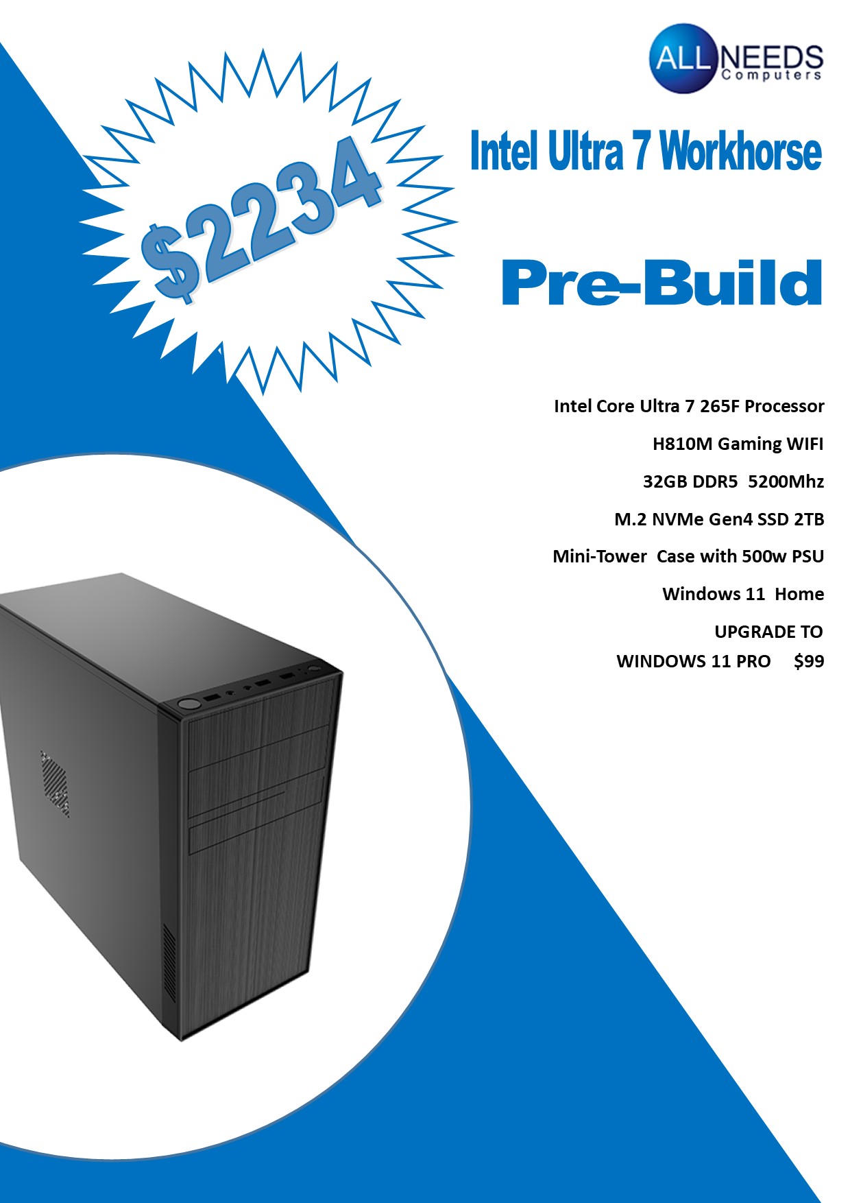 The Allneeds Ultra 7 Workhorse features an Intel Core Ultra 7 265F Processor, Gigabyte H810M Gaming WIFI DDR5 Motherboard, 32GB (2x16GB) 5200MHz CL40 DDR5, 2TB M.2 Nvme ssd, Awyun case with 500w psu and Windows 11 Home