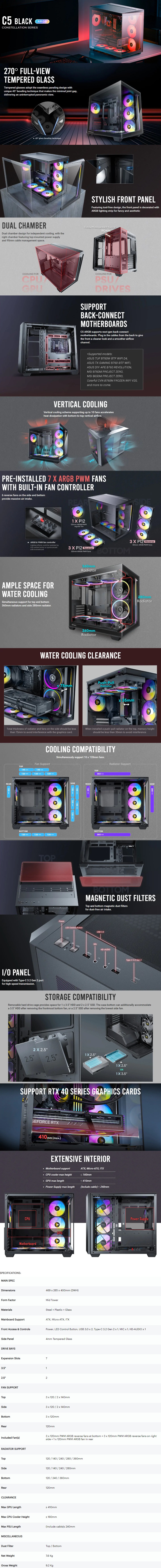 Antec C5 ARGB Tempered Glass Mid-Tower ATX Case ,Dimensions: 469 x 285 x 400mm (DWH) - Form Factor: Mid-Tower - Materials: Steel + Plastic + Glass - Mainboard Support: ATX, Micro-ATX, ITX - 4mm Tempered Glass Panel - Expansion Slots: 7 - 3.5" Bays: 1 - 2.5" Bays: 2 - Fan Support: 3x 120/2x 140mm Top, 3x 120/2x140mm Side, 3x 120mm Bottom & 1x 120mm Rear - Radiator Support: Up to 360mm Top & Bottom - C5 ARGB