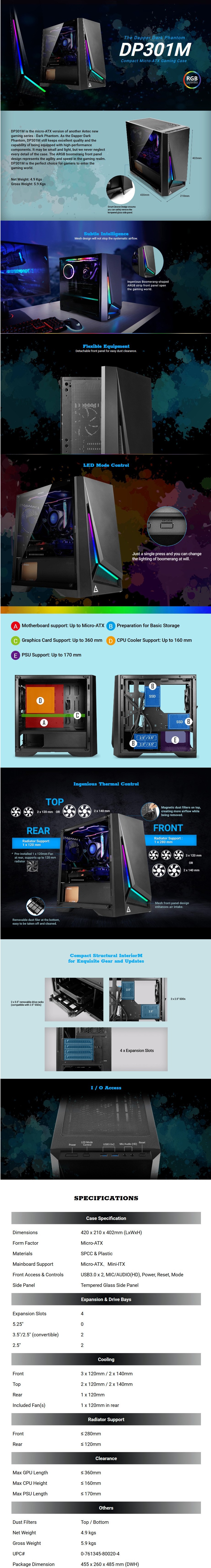 The Antec Dapper Dark Phantom DP301M Black Micro ATX Case features a Tempered Glass Side Window, 2x USB3.0, HD Audio, Fan Controller, 1x 120mm Fan pre-installed, ARGB Boomerang Front Panel with a 2 year Antec warranty.