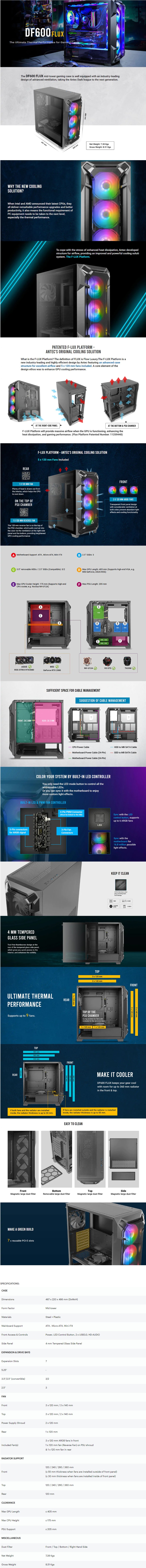 Sold Out - Check back or email us for updatesThe Antec DF600 FLUX TG Case - Black, a versatile mid-tower case designed for ATX, Micro-ATX, and Mini-ITX motherboards. Equipped with 3xARGB fans, it supports up to 3x 2.5" SSDs, 3x 3.5" removable HDDs or 2.5" SSDs. Featuring a max GPU length of 405mm