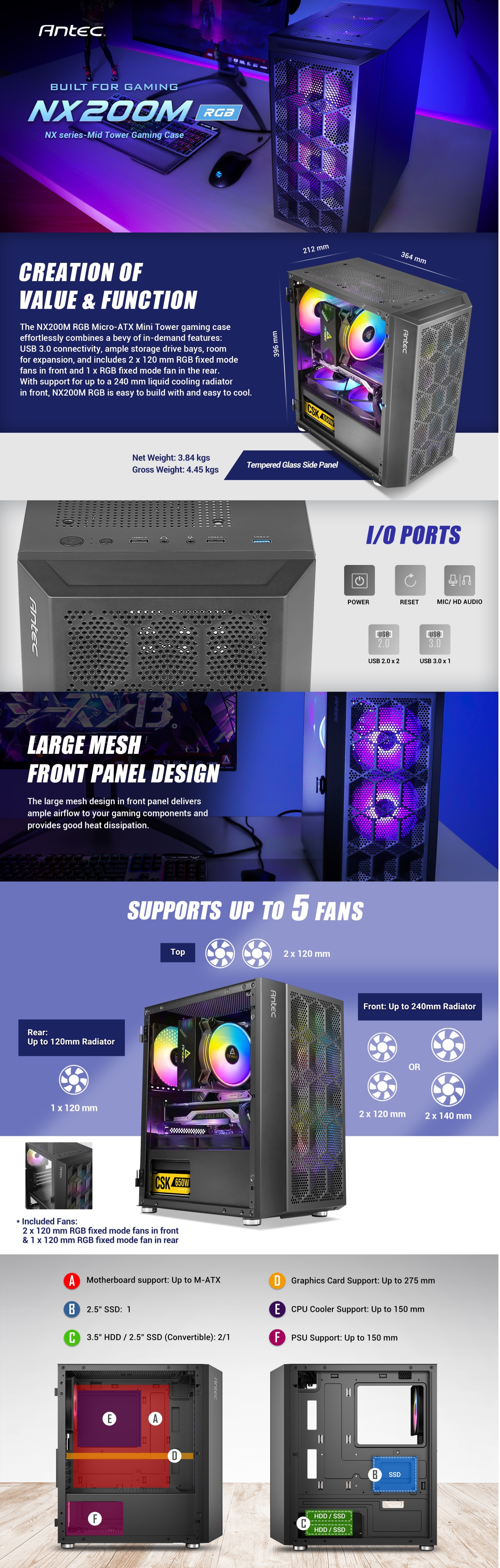 The NX200M Black RGB Micro-ATX Mini Tower gaming case effortlessly combines a bevy of in-demand features: USB 3.0 connectivity, ample storage drive bays, room for expansion, and includes three pre-installed 120mm RGB. With support for up to a 240 mm liquid cooling radiator in front, NX200M is easy to build with and easy to cool