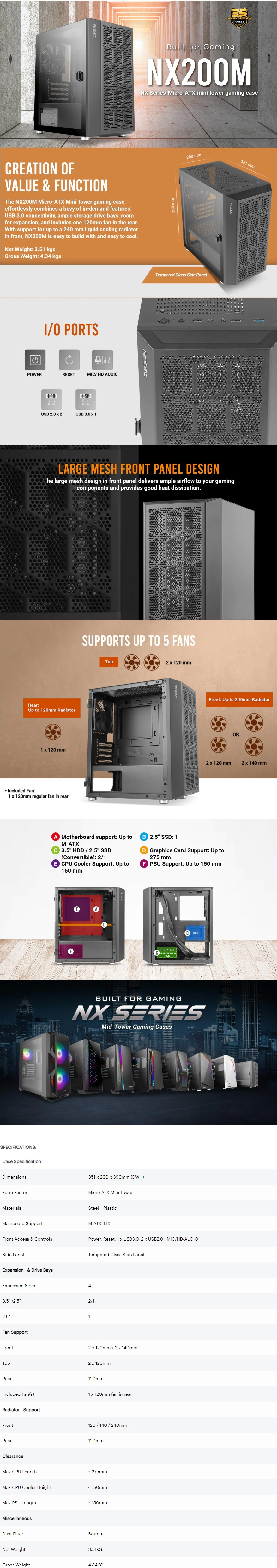 The NX200M Micro-ATX Mini Tower gaming case effortlessly combines a bevy of in-demand features: USB 3.0 connectivity, ample storage drive bays, room for expansion, and includes one 120mm fan in the rear. With support for up to a 240 mm liquid cooling radiator in front, NX200M is easy to build with and easy to cool