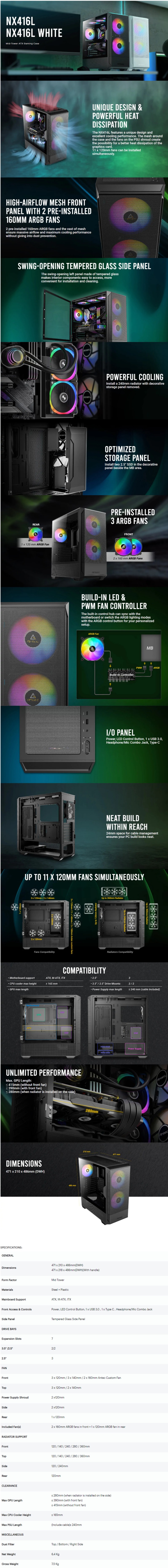 Antec NX416L Black Mid Tower ATX Case, Tempered Glass Side Panel features an 1x USB 3.0, 1x Type C, HD Audio, 2x 160mm ARGB And 1x 120mm ARGB Fans Pre-installed, Built-in LED And PWM Fan Controller, Mesh Front Panel