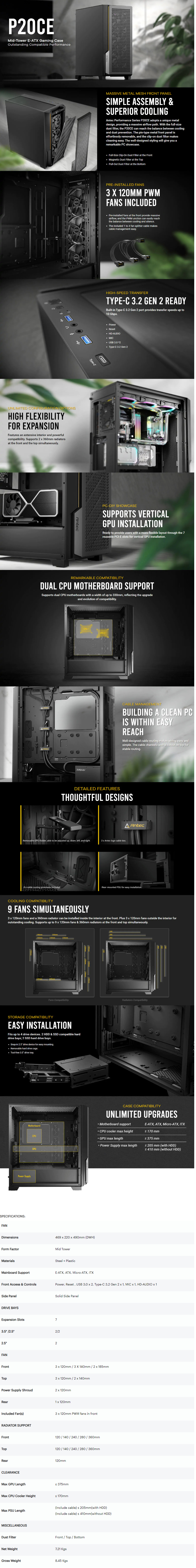 Antec Performance Series P20CE adopts a unique metal design, providing a massive airflow path. With the full-size dust filter, the P20CE can reach the balance between cooling and dust prevention 3 x 120mm PWM Fans Included Built-in Type-C 3.2 Gen 2 port