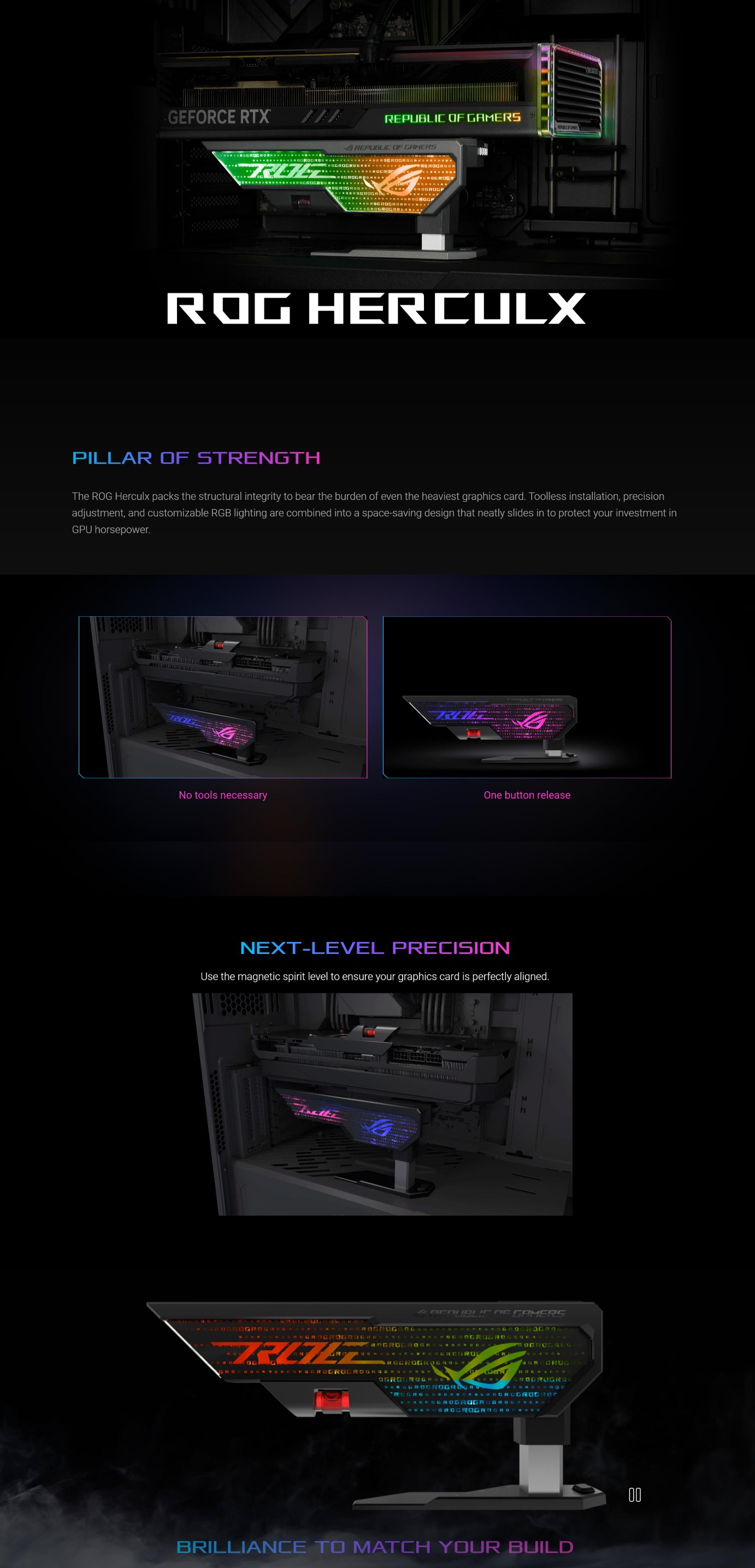 Sold Out - Check back or email us for updatesThe robust ROG Herculx Graphics Card Holder securely fortifies even the most powerful cards, plus offers an easy-to-use design and extensive compatibility. Stand design is compatible with a variety of chassis and doesn’t occupy PCIe slots it offers a support height of 72-128 mm, delivering a strong, adaptable design. Supports NVIDIA GeForce RTX 40 series graphics cards, adjustable wheel and release button enable easy, toolless setup and removal, included spirit level simplifies setup and embedded 3D ARGB element is compatible with Aura Sync.