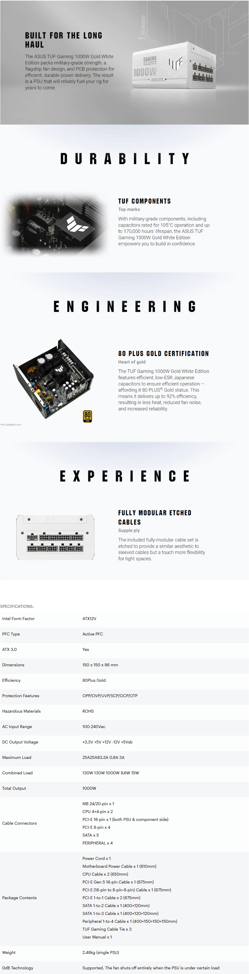 The ASUS TUF Gaming 1000W 80+ Gold White Edition is a fully modular ATX 3.0 power supply built for durability and high performance. With PCIe 5.0 support and a 16-pin cable capable of delivering up to 600W to next-gen GPUs, it’s ideal for demanding builds. It features military-grade components, dual ball-bearing Axial-tech fans, and a protective PCB coating for enhanced reliability. Certified 80+ Gold for efficiency, it offers clean cable management and a sleek white finish—backed by a Asus 10-year warranty.