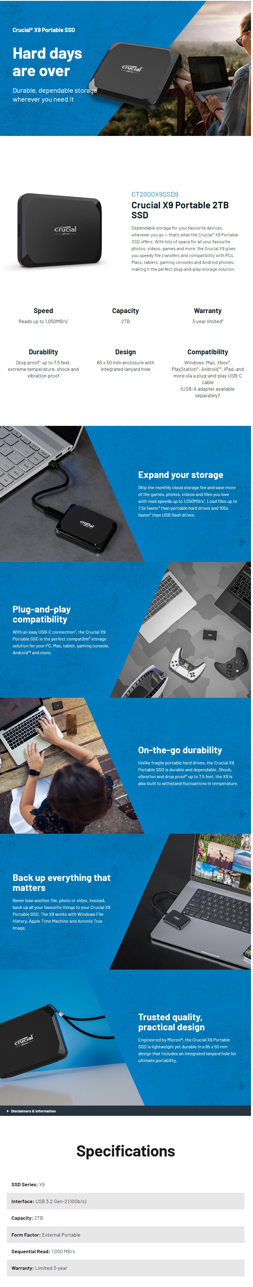 The Crucial X9 is a portable SSD and features sequential read/write speed of 1050MB/s, 2TB capacity, high durability and is compatible with Windows, Mac, Android, IPad, PC and Linux.