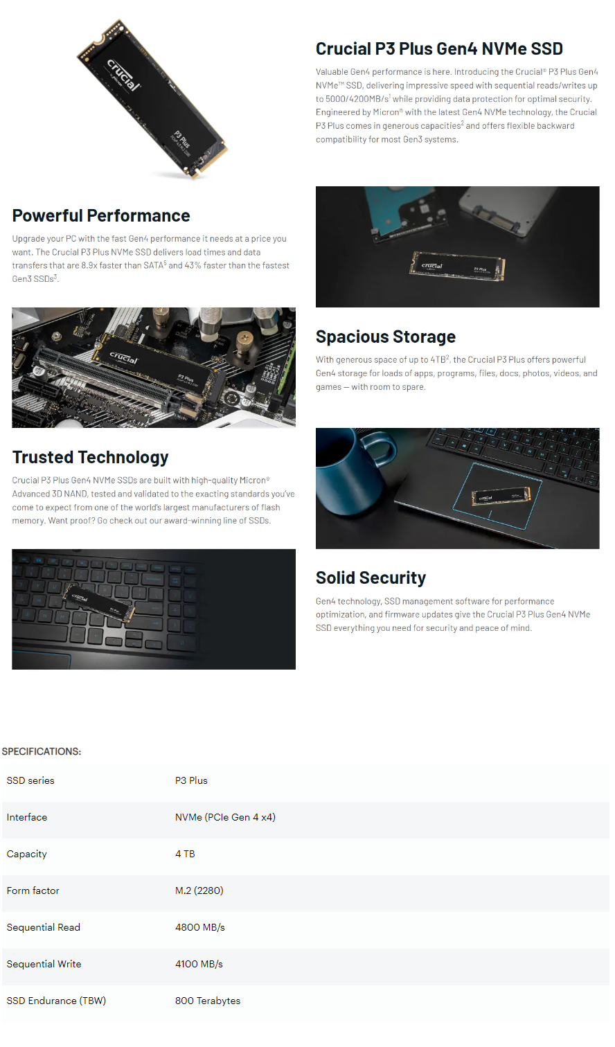 Sold Out - Check back or email us for updatesThe Crucial P3 Plus M.2 NVMe SSD 4TB features a sequential read/write speed of 4,800/4,100MB/s with a capacity of 4TB and 800TBW. This SSD supports the PCIe Gen 4x4 interface and is built with 3D NAND technology.