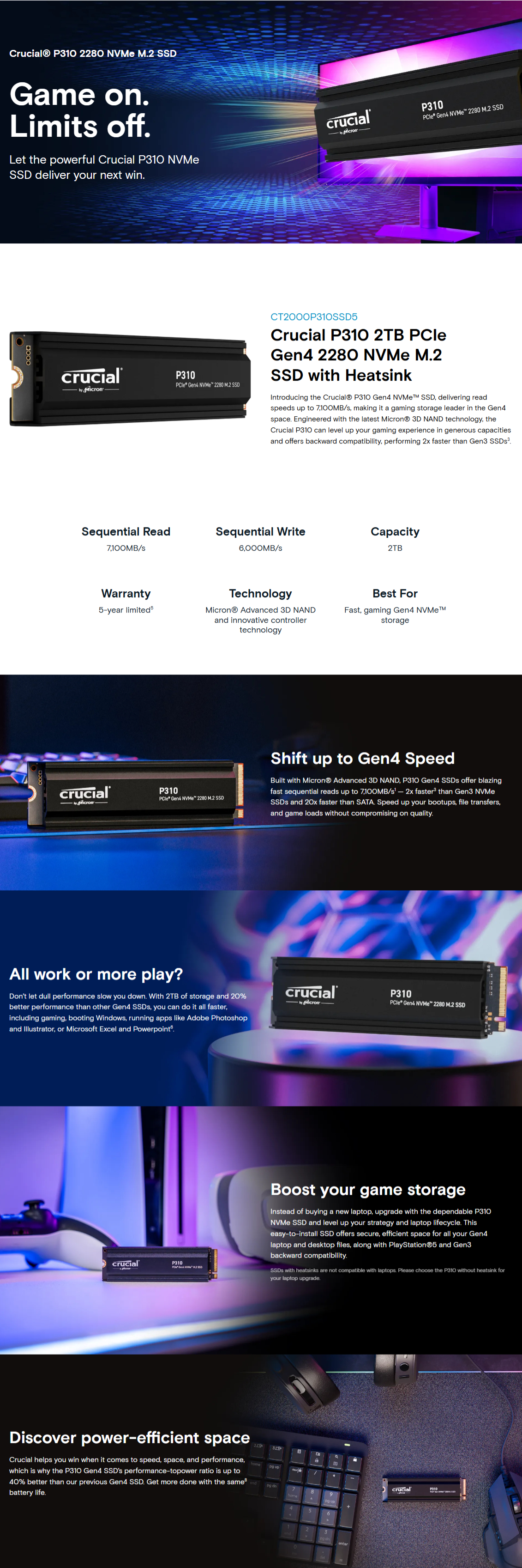 The Crucial P310 2TB NVMe PCIe Gen4 SSD with heatsink (CT2000P310SSD5) delivers fast Gen4 performance with high sequential read and write speeds, a durable NVMe controller, and a built‑in heatsink that keeps temperatures stable under sustained workloads. Its 2TB capacity, M.2 2280 form factor, and PCIe Gen4 x4 interface make it suitable for modern desktops needing quick boot times, rapid application loading, and reliable long‑term storage efficiency.