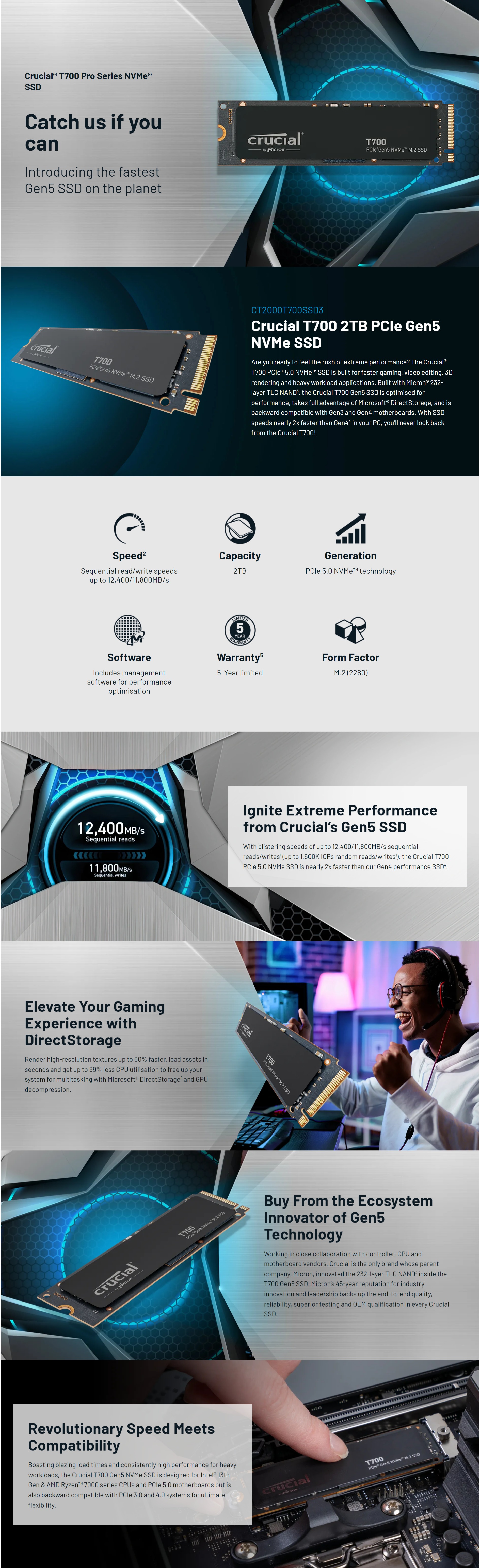 Sold Out - Check back or email us for updatesThe Crucial T700 SSD offers speeds of up to 12,400Mb/s sequential read and up to 11,800Mb/s sequential write (up to 1,500K IOPS random reads/writes) for faster gaming, video editing, 3D rendering and heavy workload applications, and features 2TB of capacity.