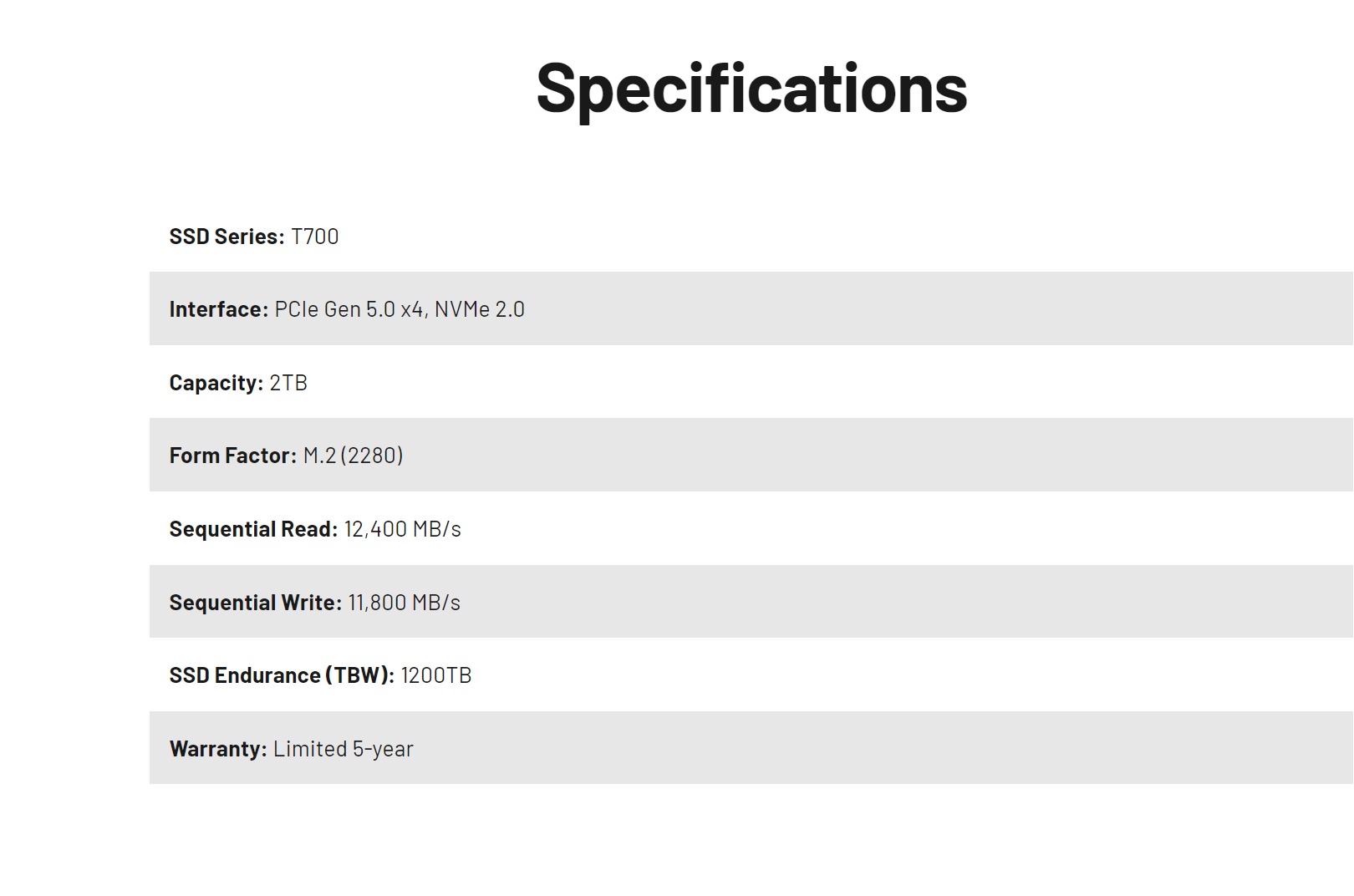 The Crucial T700 SSD offers speeds of up to 12,400Mb/s sequential read and up to 11,800Mb/s sequential write (up to 1,500K IOPS random reads/writes) for faster gaming, video editing, 3D rendering and heavy workload applications, and features 2TB of capacity.