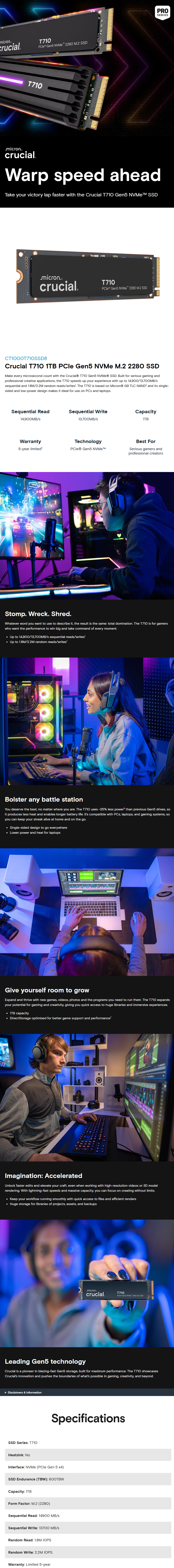 Sold Out - Check back or email us for updatesThe Crucial T710 1TB PCIe Gen5 NVMe SSD delivers ultra-fast performance tailored for elite gaming and creative workloads. Built on the PCIe 5.0 interface with NVMe technology, this M.2 2280 drive achieves sequential read/write speeds up to 14,900/13,700MB/s, making it one of the fastest consumer SSDs available. It features TLC NAND, AES-256 encryption, and DirectStorage-optimized firmware for accelerated game loading and real-time rendering. With up to 2.3 million IOPS and 2400TBW endurance, it’s engineered for reliability and sustained peak performance. Available with or without a heatsink, it suits a wide range of desktop and laptop builds, backed by a 5-year Crucial warranty