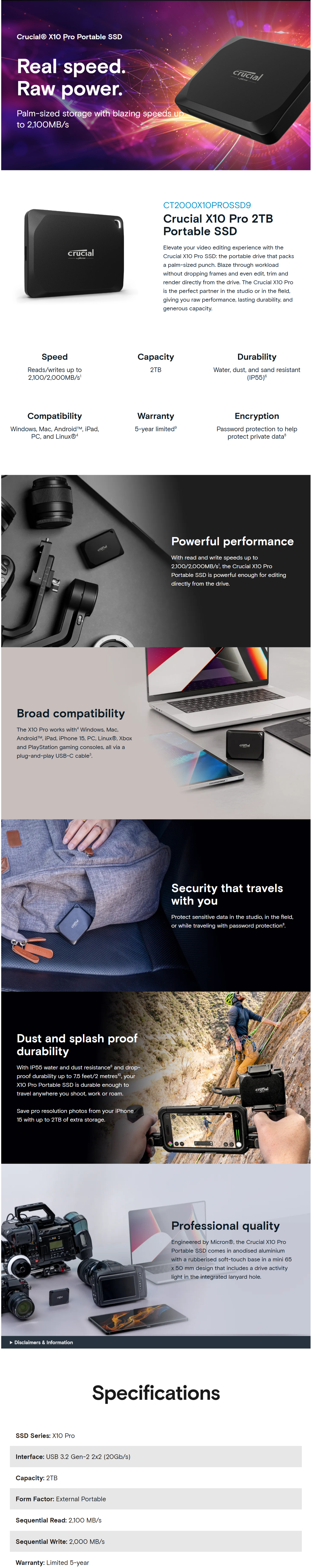 Crucial X10 Pro 2TB USB-C External Portable SSD - Storage Capacity: 2 TB - Read Speed: Up to 2,100MB/s - Write Speed: Up to 2,000MB/s - Interface: USB Type-C 3.2 Gen2x2 (20Gb/s) - Durability: IP55 - Compatibility: Windows, Mac, Android, iPad, Linux, PlayStation and Xbox - Security: Password protection and 256-bit AES hardware encryption