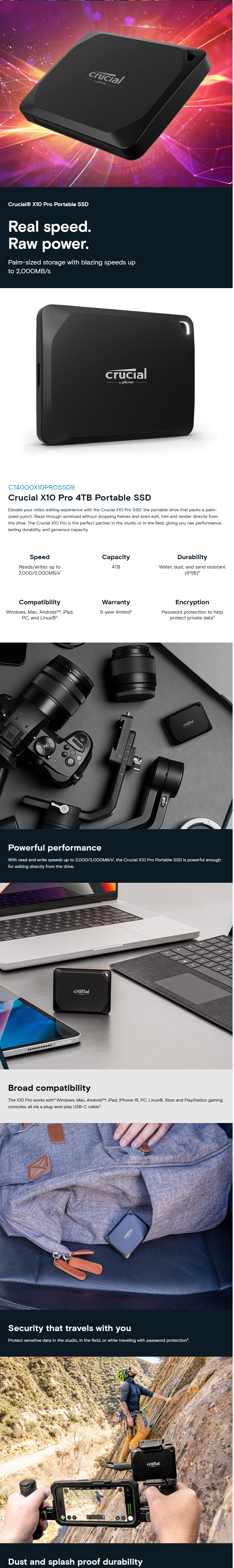Sold Out - Check back or email us for updatesThe X10 comes in 4TB, 2TB, and 1TB capacities, with a claimed and documented (by Crucial) write speed of 2000 MB/s and read speed of 2100 MB/s. At roughly 2” by 2.5” by 3/8” and weighing 42 grams (about 1 & 1/2 ounces), the X10 Pro is portable enough for use in the field such that it contains a slot to attach it to a key ring or lanyard