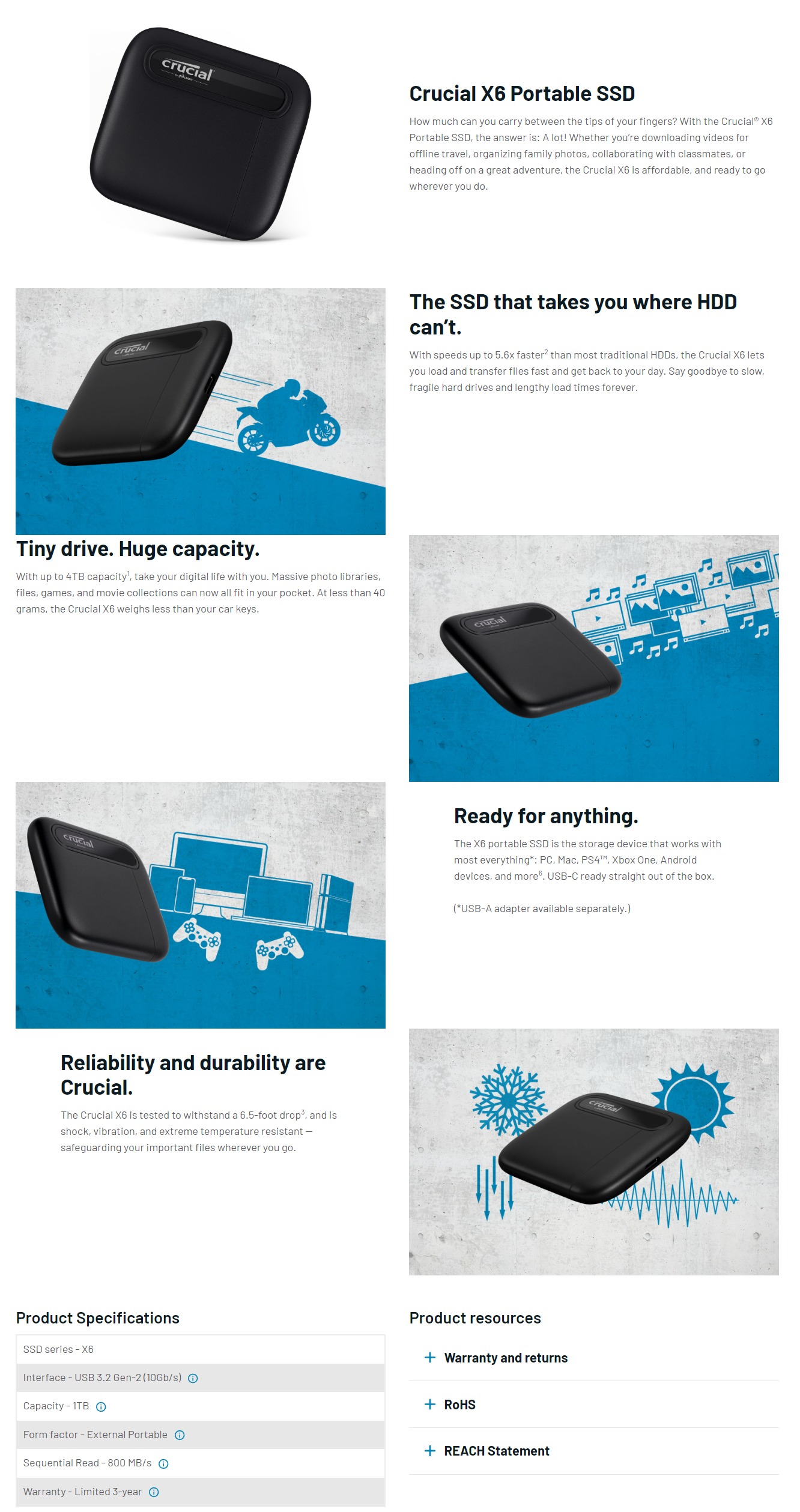 Sold Out - Check back or email us for updatesCrucial X6 Portable SSD How much can you carry between the tips of your fingers? With the Crucial® X6 Portable SSD, the answer is: A lot! Whether you’re downloading videos for offline travel, organizing family photos, collaborating with classmates, or heading off on a great adventure, the Crucial X6 is affordable, and ready to go wherever you do. The SSD that takes you where HDD can’t. With speeds up to 5.6x faster2 than most traditional HDDs, the Crucial X6 lets you load and transfer files fast and get back to your day. Say goodbye to slow, fragile hard drives and lengthy load times forever.