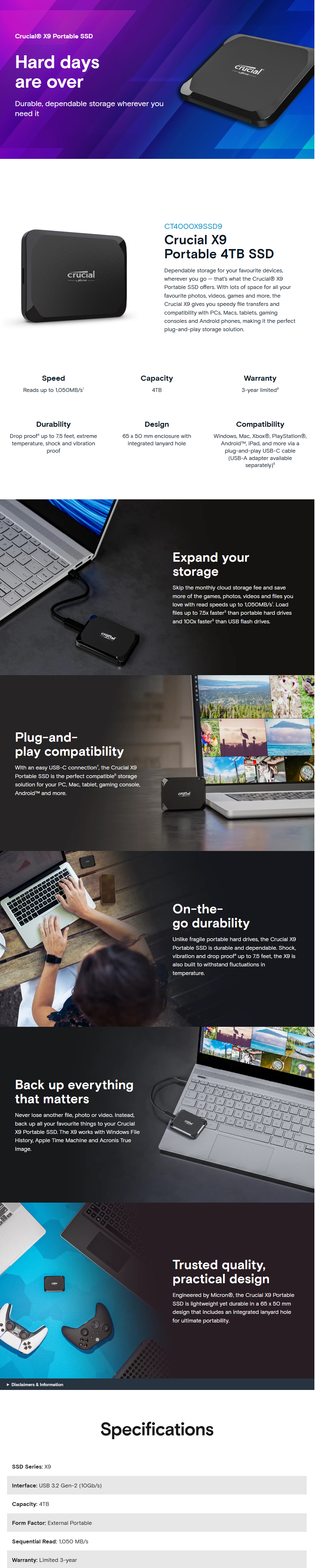 Sold Out - Check back or email us for updatesCrucial X9 4TB External Portable SSD ~1050MB/s USB3.1 Gen2 USB-C Durable Drop Shock Proof for PC MAC PS5 Xbox Android iPad Pro