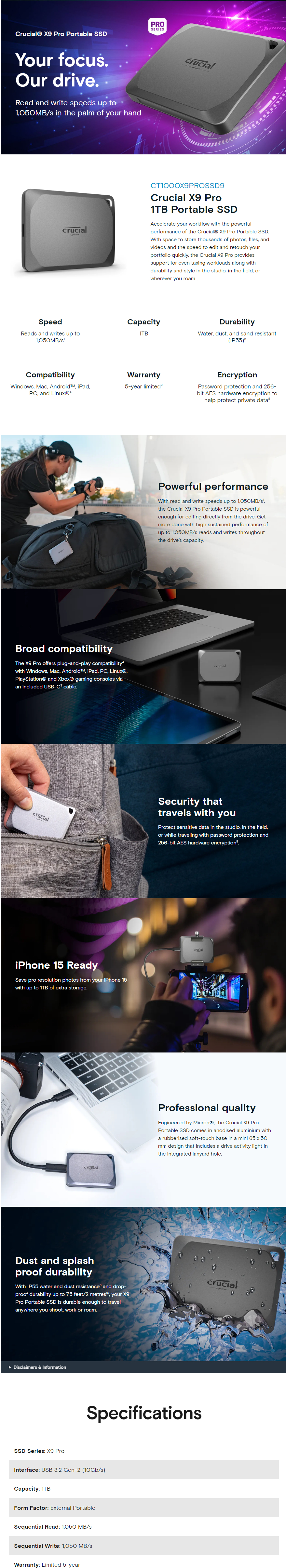 Crucial X9 Pro 1TB External Portable SSD ~1050MB/s USB-C Durable Rugged Shock Water Dush Sand Proof for PC MAC PS4 Xbox Android iPad Pro Powerful performance With read and write speeds up to 1,050MB/s1, the Crucial X9 Pro Portable SSD is powerful enough for editing directly from the drive. Get more done with high sustained performance of up to 1,050MB/s reads and 975MB/s writes throughout the drive’s capacity.