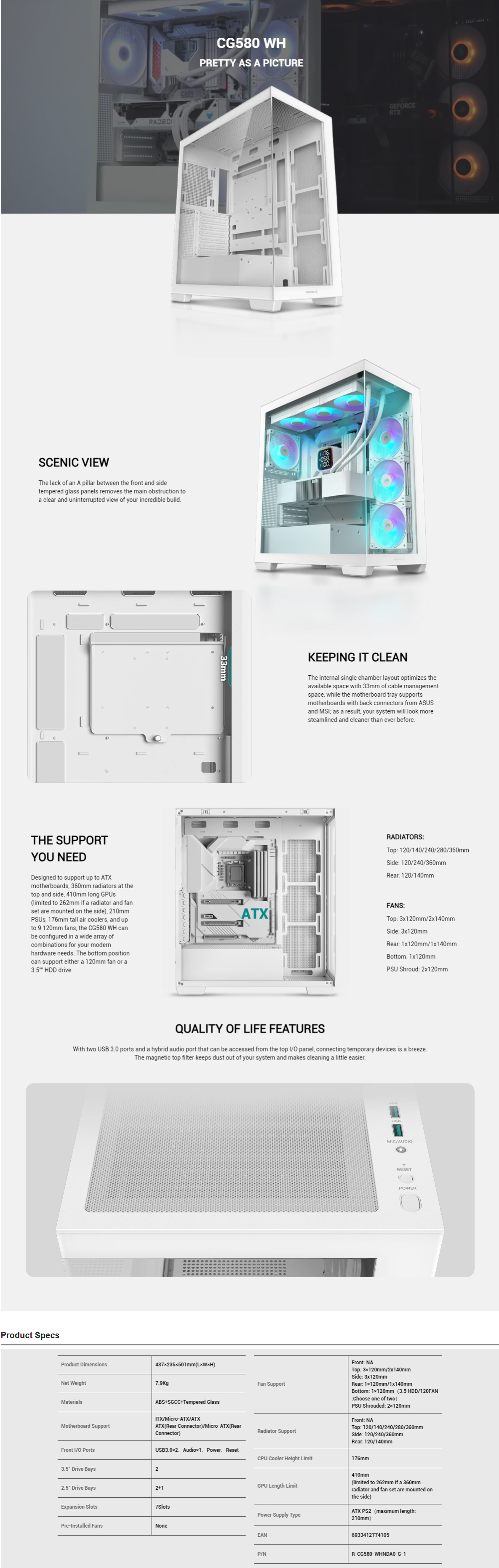 The CG580 WH is a white-coated, picturesque single-chamber panoramic case that was built to accommodate the most commonly used components available while showing them off in style. With support for 360mm radiators and numerous fan configurations, the CG580 WH is also extremely functional. No fans are included, so the case is fully primed to accept your favorite cooling fans.