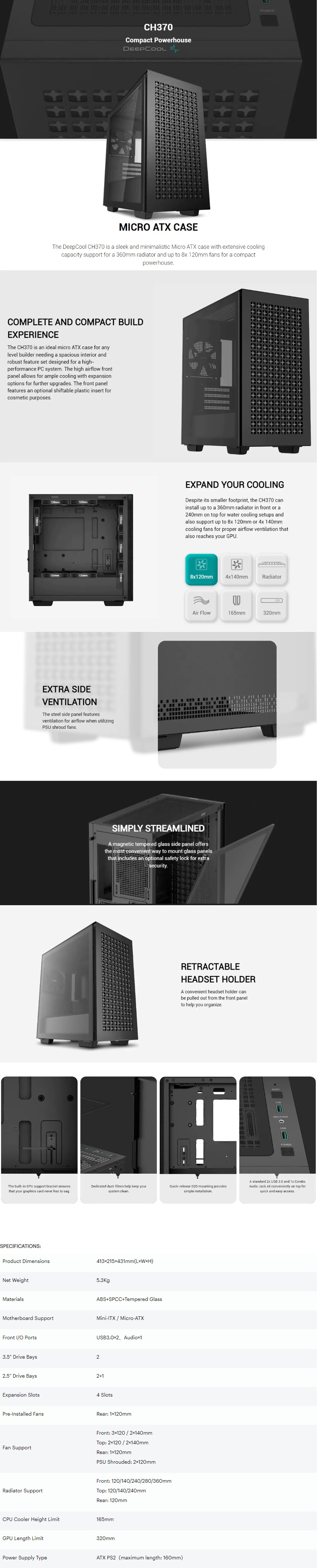 The DeepCool CH370 is a sleek and minimalistic Micro ATX case with extensive cooling capacity support for a 360mm radiator and up to 8x 120mm fans for a compact powerhouse.