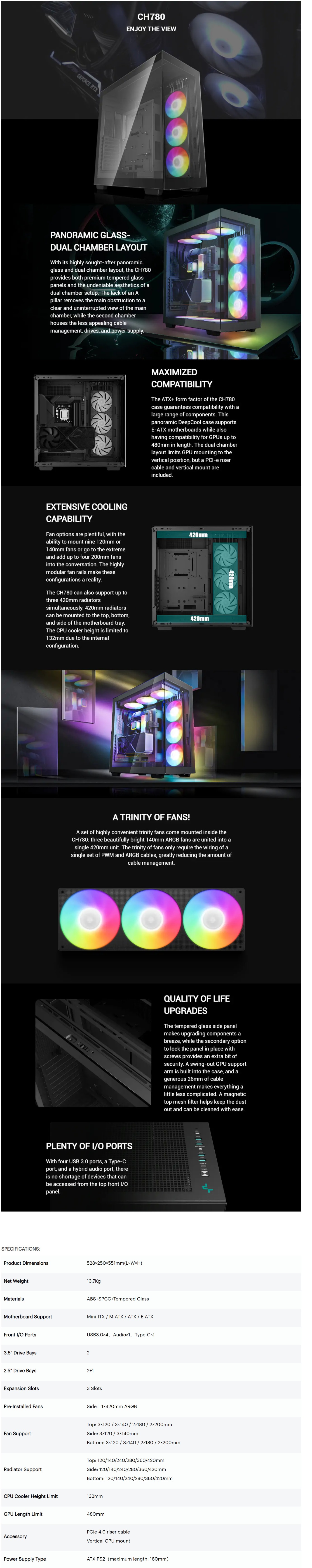The CH780 is a majestic premium ATX+ case that places an emphasis on displaying the beauty of the high-end hardware inside. Air flow and radiator compatibility are not ignored, as there are a plethora of fan and radiator combinations. Beauty and air flow without the need for a mesh front panel.