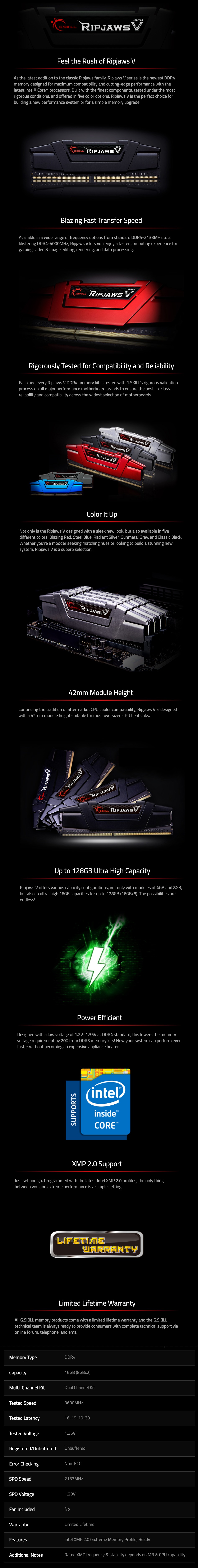 As the latest addition to the classic Ripjaws family, Ripjaws V series is the newest DDR4 memory designed for maximum compatibility and cutting-edge performance with the latest Intel Core processors.
