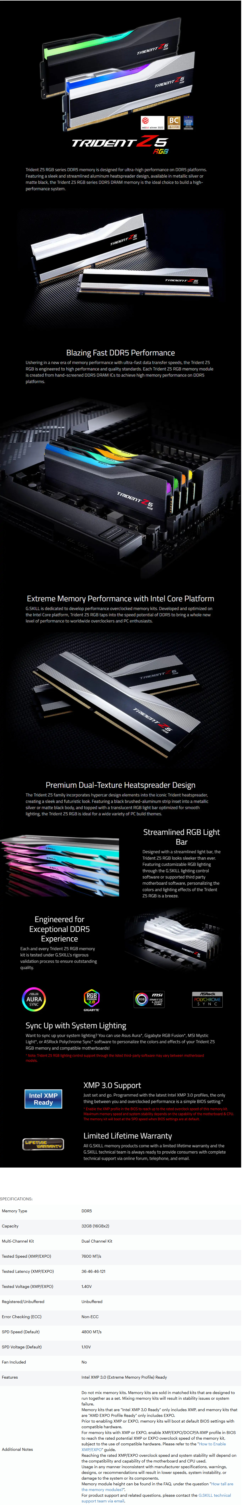Sold Out - Check back or email us for updatesThe G.SKILL Trident Z5 RGB DDR5 memory kit (F5-7600J3646G16GX2-TZ5RK) is a high-end dual-channel kit designed for enthusiasts seeking extreme speed and style. This kit provides 32GB capacity (2x16GB) with an ultra-fast 7600MHz frequency, optimized for Intel platforms via XMP 3.0 profiles. It runs at CL36-46-46-121 timings with a tested voltage of 1.40V, balancing raw speed with stability for demanding workloads and gaming