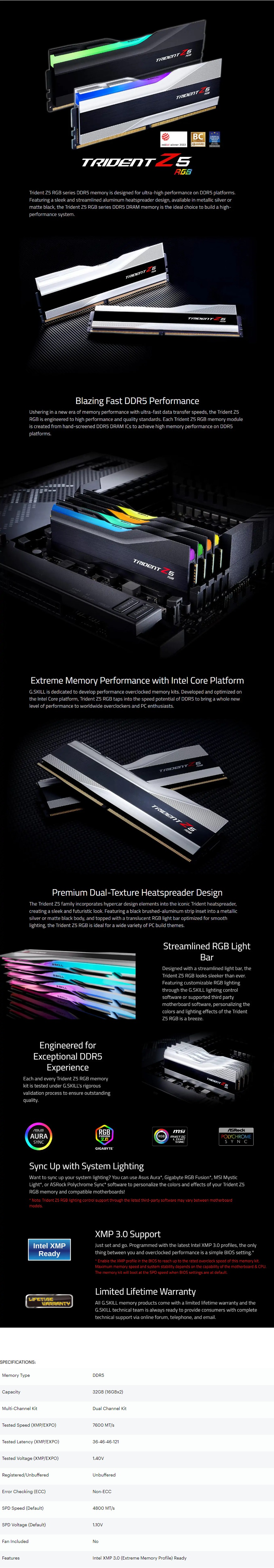 Sold Out - Check back or email us for updatesThe G.Skill Trident Z5 RGB 32GB (2x16GB) features 7600MHz CL36 DDR5 memory, tested latency of 36-46-46-121