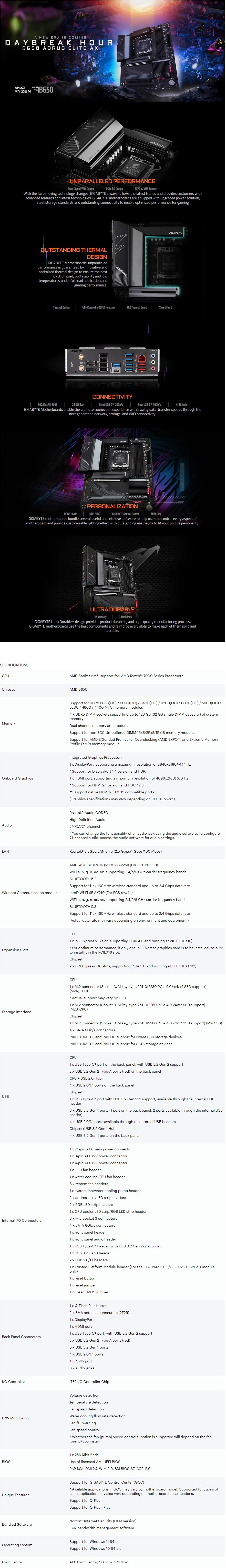 Sold Out - Check back or email us for updatesThe Gigabyte B650 Aorus Elite AX DDR5 Motherboard supports AMD Ryzen 7000 Series Processors, features 4 x DDR5 memory slots, PCI-E 4.0, PCI-E 3.0 expansion slots, 3 x M.2 slots, 4 x SATA ports (6GB/s), 11 x rear USB ports, 8 x internal header USB ports, Realtek 2.5GbE LAN, Realtek audio codec, and an ATX motherboard form factor with a 3 year Gigabyte warranty.