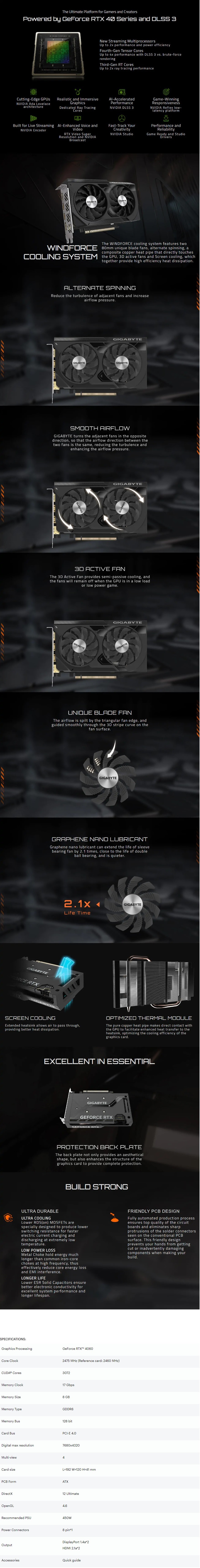 The Gigabyte GeForce RTX 4060 Windforce graphics card features a 2475MHZ core clock, 8GB GDDR6 128-bit memory interface, 17Gbp/s memory speed, 2 x DisplayPort 1.4a, 2 x HDMI 2.1a, OpenGL 4.6, and DirectX 12 Ultimate support with a 3 year Gigabyte warranty.