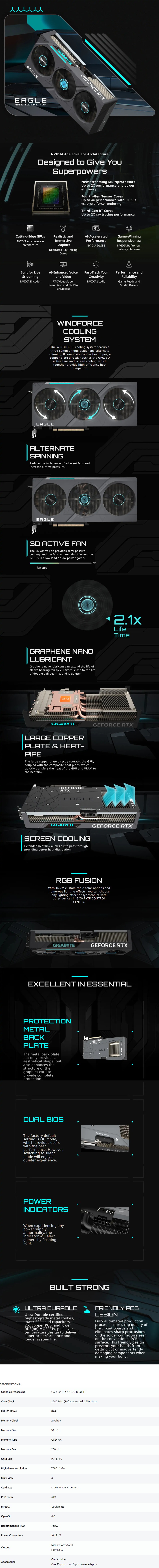 The Gigabyte GeForce RTX 4070 Ti Super Eagle OC graphics card features a 2640MHz core clock, 16GB GDDR6X 256-bit memory interface, 21Gb/s memory speed, 1 x HDMI 2.1a, 3 x DisplayPort 1.4a, HDCP support, OpenGL 4.6 and DirectX 12 Ultimate support and RGB lighting.