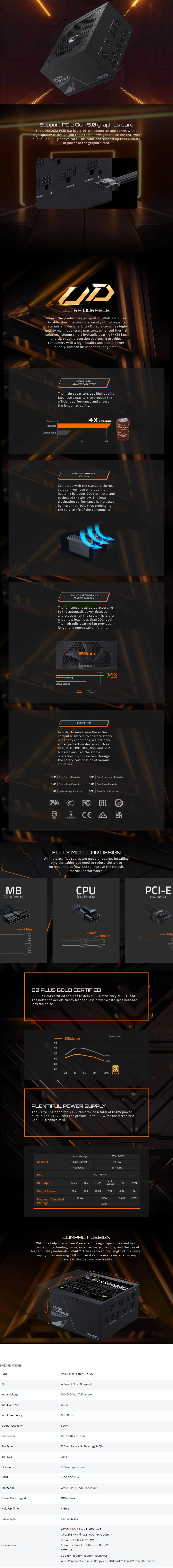 Sold Out - Check back or email us for updatesThe Gigabyte Ultra Durable 850W is ready to power your next-gen hardware. The wattage marked on the 12VHPWR’s connector is the recommended wattage. The native 16 PIN (12VHPWR) PCIe connector can deliver up to 600W for PCIe 5.0 graphics cards, 80 PLUS Gold certified, compatible with Intel’s ATX 3.0 specifications and includes 12VHPWR connector.