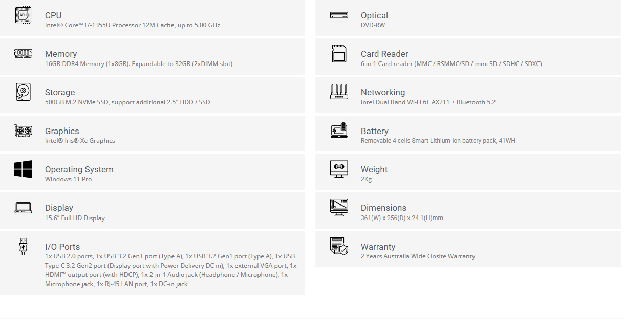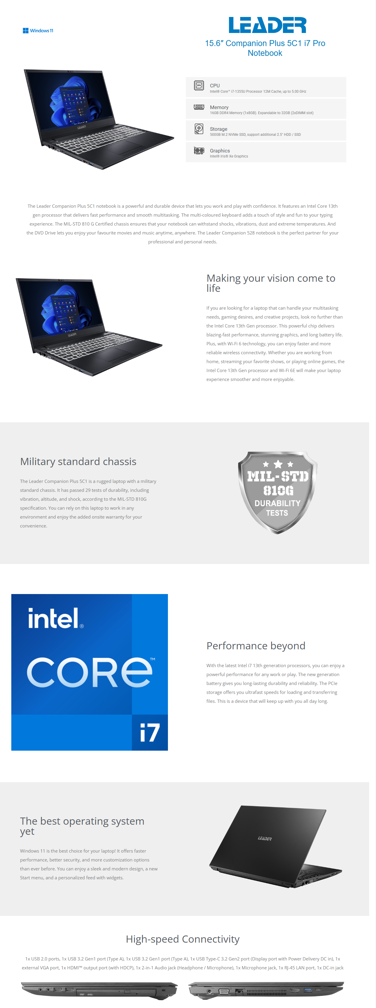 Sold Out - Check back or email us for updatesLeader Companion Plus 5C1, 15.6" FHD, Intel i7-1355U, 16GB DDR4, 500GB NVMe SSD, DVDRW, Wi-Fi 6, Iris® Xe, HD Camera, Windows 11 Pro, 2 Year Warranty
