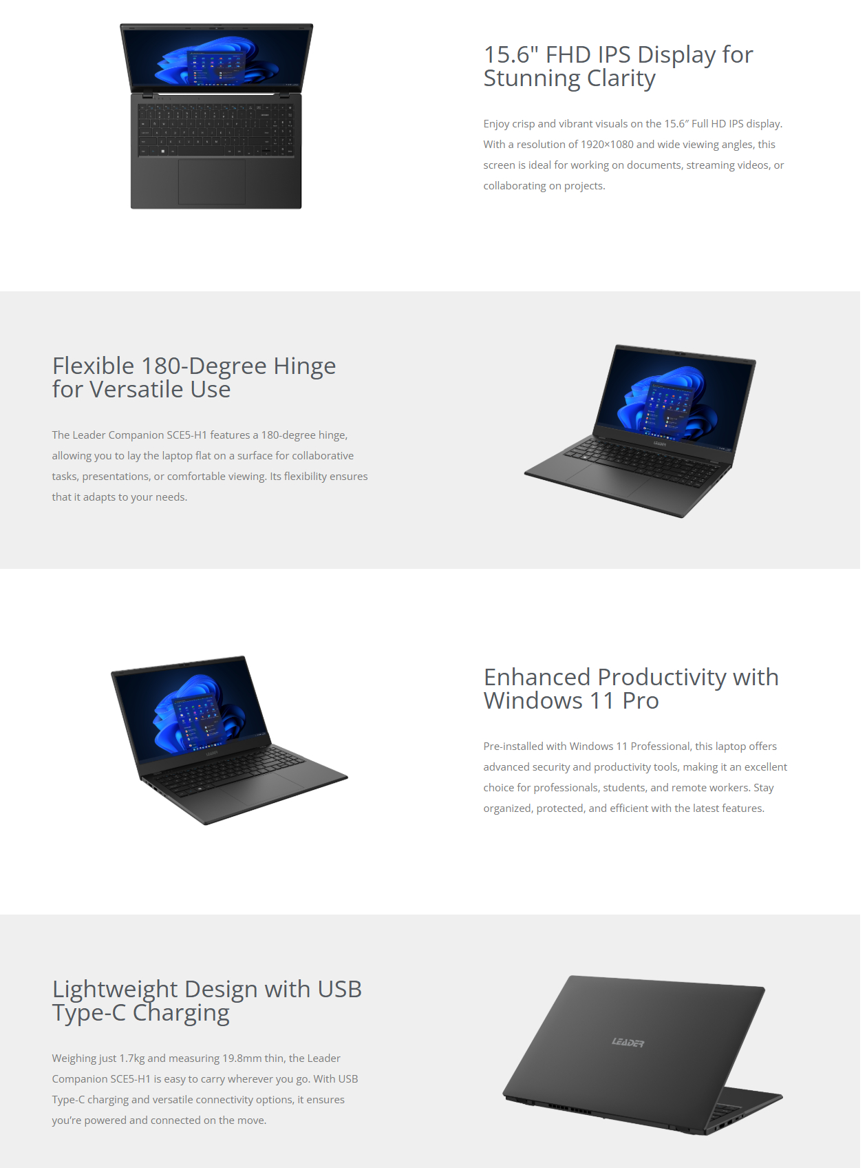 The Leader Companion SCE5-H1-C81TBP features an Intel® Celeron® Processor N4020, 8GB DDR4, Intel® UHD Graphics 600, 1TB GB M.2 NVMe SSD, 15.6" 1920x1080 IPS-level display, Wireless AC , 2x USB 3.0 1x USB 2.03.5mm headphone jack 1x DC in1x HDMI 1.41× Full function USB Type-C (Power Delivery and DisplayPort) , Microsoft Windows 11 Professional with a 1 year Leader warranty.