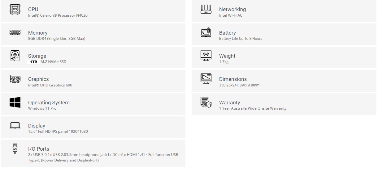 Click and Collect / Online AvailableThe Leader Companion SCE5-H1-C81TBP features an Intel® Celeron® Processor N4020, 8GB DDR4, Intel® UHD Graphics 600, 1TB GB M.2 NVMe SSD, 15.6" 1920x1080 IPS-level display, Wireless AC , 2x USB 3.0 1x USB 2.03.5mm headphone jack 1x DC in1x HDMI 1.41× Full function USB Type-C (Power Delivery and DisplayPort) , Microsoft Windows 11 Professional with a 1 year Leader warranty.
