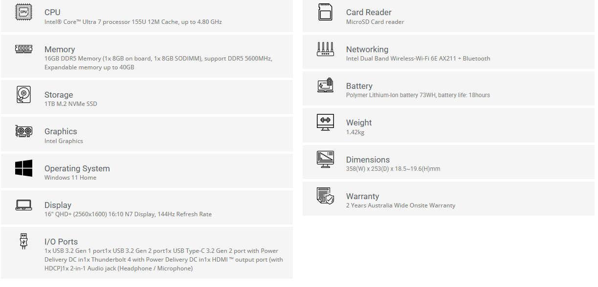 Sold Out - Check back or email us for updatesLeader Companion Ultimate AI PC 6C1, 16" QHD+ 165Hz Display , Intel U7-155U, Intel AI NPU, 16GB DDR5, 1TB NVMe SSD, Wi-Fi 6E, TB4, IR Cam, Magnesium Alloy Chassis ,Windows 11 Home backed by 2 years Australia wide Leader warranty