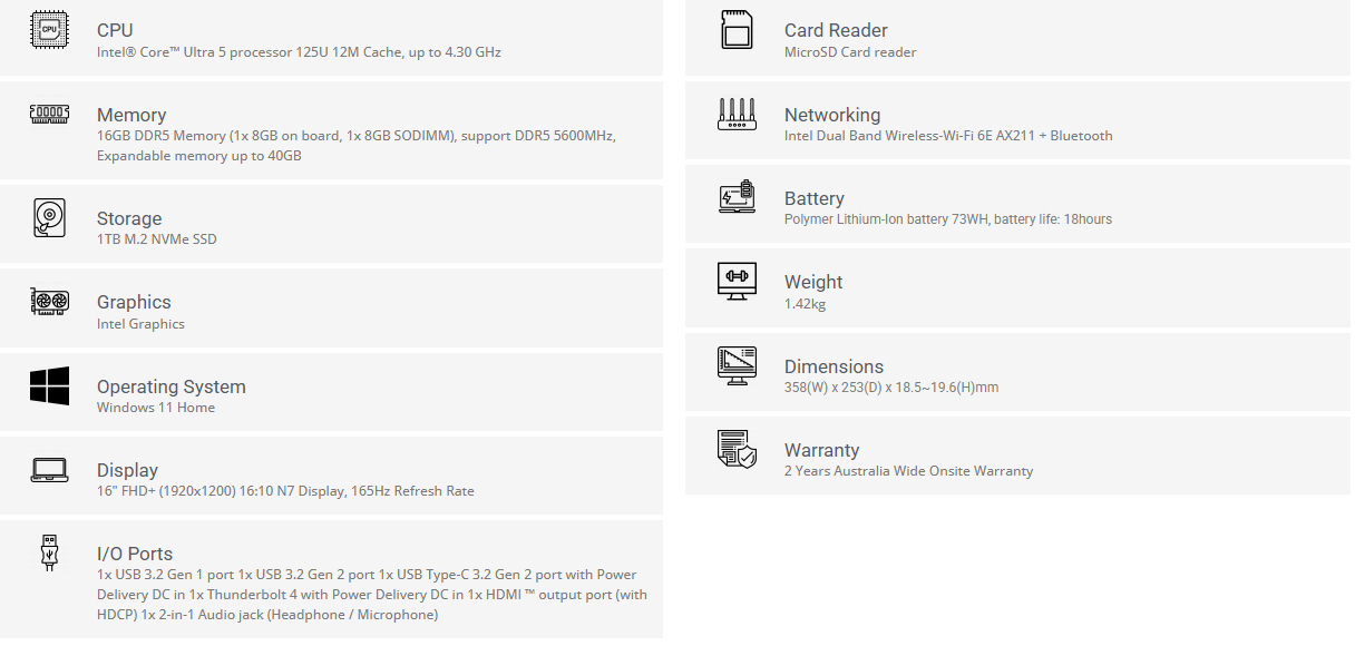 Available 1-2 days from orderLeader Companion Ultimate AI PC 6C1, 16" FHD+ 165Hz Display , Intel U5-125U, Intel AI NPU, 16GB DDR5, 1TB NVMe SSD, Wi-Fi 6E, TB4, IR Cam, Windows 11 Home backed by 2 years Australia wide Leader warranty