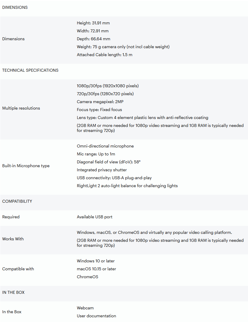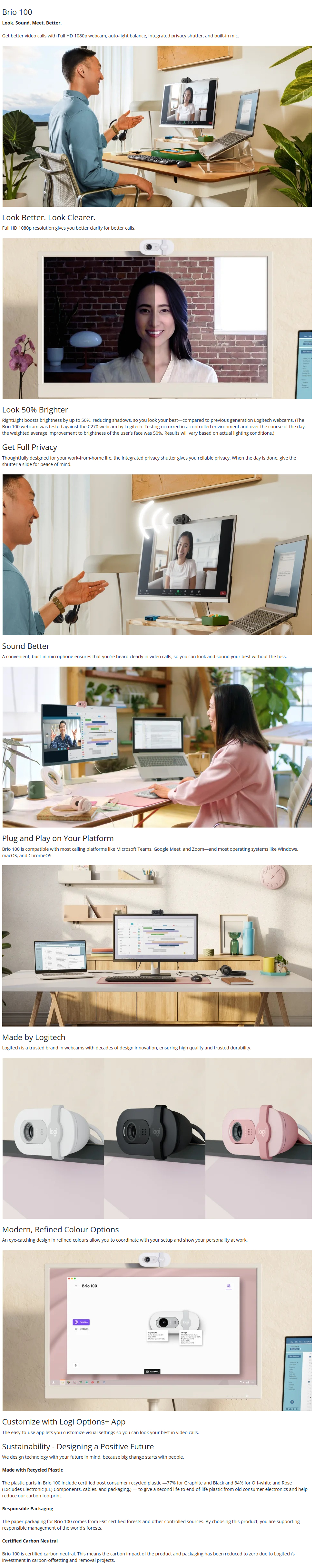 The Logitech BRIO 100 Full HD 1080p Webcam 960-001618 features a sleek design, Full HD 1920 x 1080 resolution, RightLight 2 auto-light balance to boost brightness by up to 50%, built-in omnidirectional microphone, privacy shutter, and is plug and play with most calling platforms and operating systems like Windows, Mac OS and ChromeOS. It offers customisation options for visual settings using the Logi Options+ app, and is carbon-neutral certified.