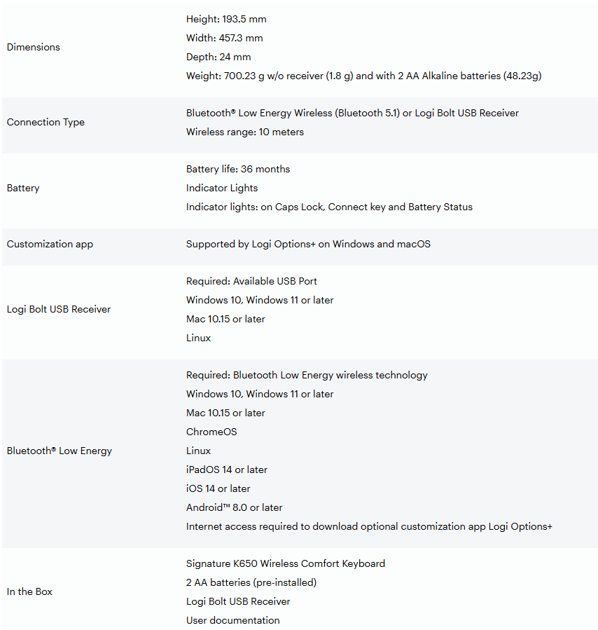 The Logitech Signature K650 Wireless Keyboard in graphite offers a comfortable and efficient typing experience with its integrated palm rest and deep-cushioned keys. Designed for multi-platform use, it features a full-size layout with handy shortcuts like screenshot, mic mute/unmute, and web navigation. It connects via Bluetooth or the Logi Bolt USB receiver