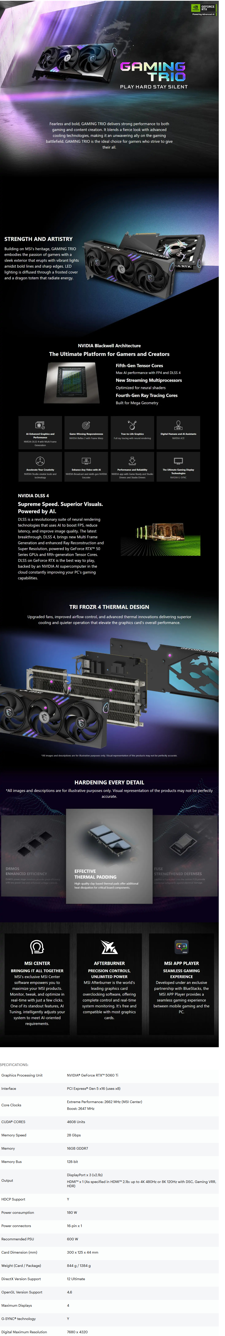 The MSI GeForce RTX 5060 Ti Gaming Trio OC 16GB (G506T‑16GTC) is a high‑performance graphics card built on NVIDIA’s Blackwell architecture, designed to deliver strong gaming and content‑creation capabilities with advanced AI and ray‑tracing features. It features 4608 CUDA cores, 16GB of ultra‑fast GDDR7 memory, and boost clocks up to 2647 MHz, giving it excellent throughput for modern titles and creative workloads. The card uses MSI’s TRI FROZR 4 cooling system with a nickel‑plated copper baseplate and Air Antegrade Fin 2.0 design to maintain low temperatures under heavy load, while its bold triple‑fan aesthetic and RGB accents match the premium Gaming Trio look. Connectivity includes 3× DisplayPort 2.1b and 1× HDMI 2.1b, and power is supplied via a 16‑pin connector, with a recommended PSU of 450W. Overall, it’s a robust, future‑ready GPU aimed at gamers and creators who want smooth performance, efficient cooling, and next‑generation AI enhancements