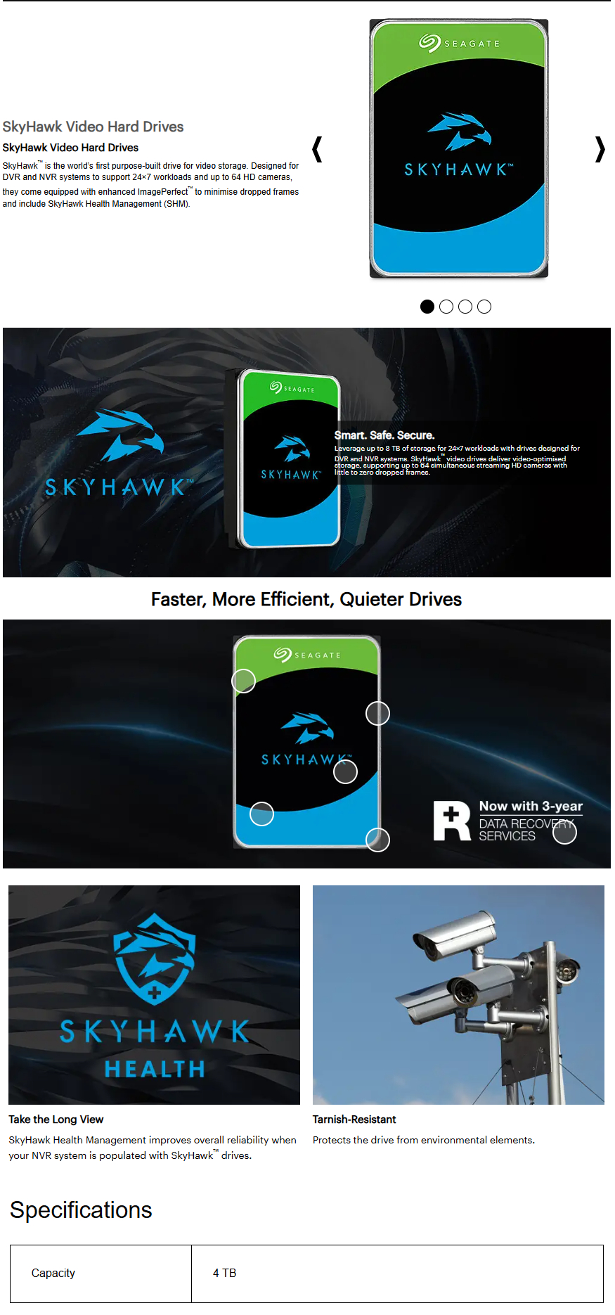 The Seagate 4TB SkyHawk is a surveillance‑optimised 3.5‑inch hard drive built for NVR systems, delivering up to 180MB/s sustained transfer rates and backed by a 256MB cache for smooth, continuous recording. Its CMR recording technology ensures consistent performance, while integrated RV sensors help maintain reliability in multi‑drive enclosures. With a 1‑million‑hour MTBF and firmware tuned for 24/7 workloads, it’s engineered for dependable, long‑term video capture in security environments.