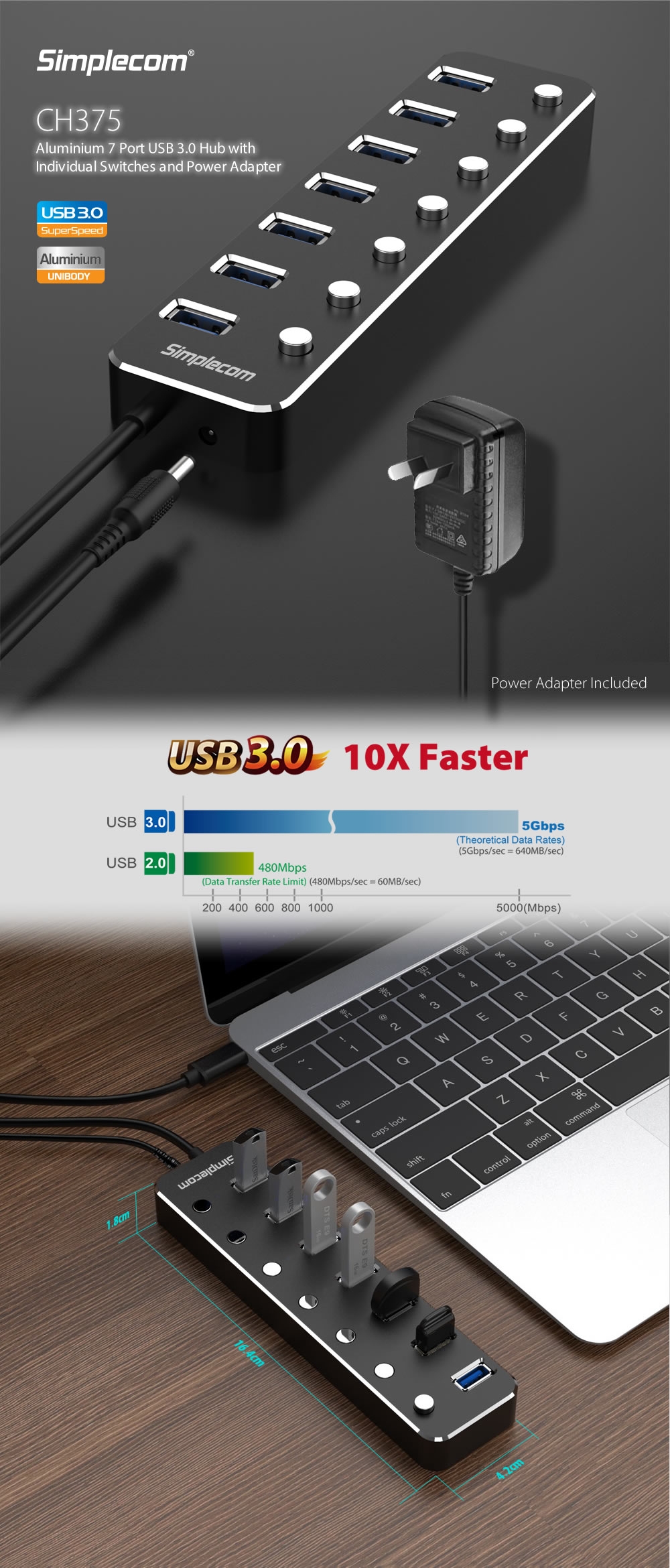 Simplecom CH375PS Aluminium 7 Port USB 3.0 Hub with Individual Switches