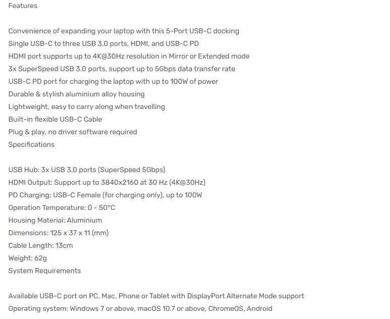 Simplecom CH545 USB-C 5-in-1 Multiport Adapter Docking Station This USB-C multiport docking station is designed to extend the connectivity for modern laptops with multifunctional USB-C interface. It turns a single USB-C port into 5 ports, including three SuperSpeed USB 3.0 ports, HDMI display output, and one USB-C PD charging port. The HDMI port supports transmitting video with resolution up to 4K@30Hz, and the 3-Port USB 3.0 hub provides up to 5Gbps data transfer rate. The USB-C PD port can charge your connected laptop while other ports are working, supporting up to 100W charging via Power Delivery.