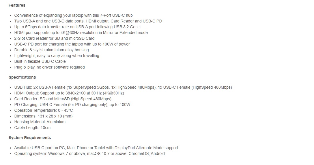 Sold Out - Check back or email us for updatesCH547 is a 7-in-1 portable USB-C multiport adapter for modern laptops with multifunctional USB-C port, you can get the most out of your laptop through a single USB-C interface. It turns a single USB-C port into 7 ports, including two USB-A and one USB-C date ports, SD and MicroSD card reader, HDMI video output, USB-C PD charging.