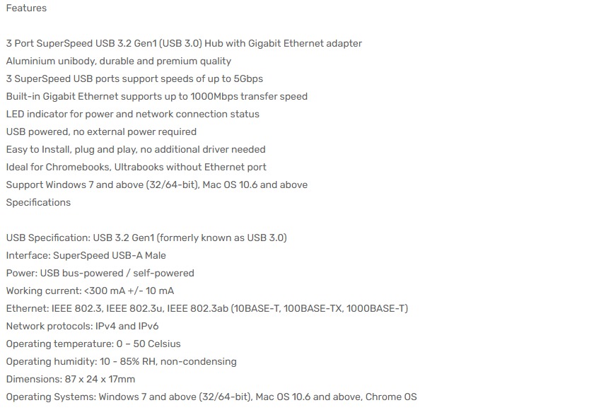 Simplecom CHN420 Silver Aluminium 3 Port SuperSpeed USB HUB with Gigabit Ethernet Adapter Access and transfer data more efficiently. Three SuperSpeed USB ports support data transfer rates of up to 5Gbps, and RJ45 Gigabit Ethernet port supports up to 1000Mbps transfer speed. CHN420 is sturdy and durable with premium aluminium body. Simple and easy to use with 3 USB ports on the top and an innovative built-in RJ45 Gigabit Ethernet adapter on the end, accommodate your collection of USB device without cluttering your desk space.<p>