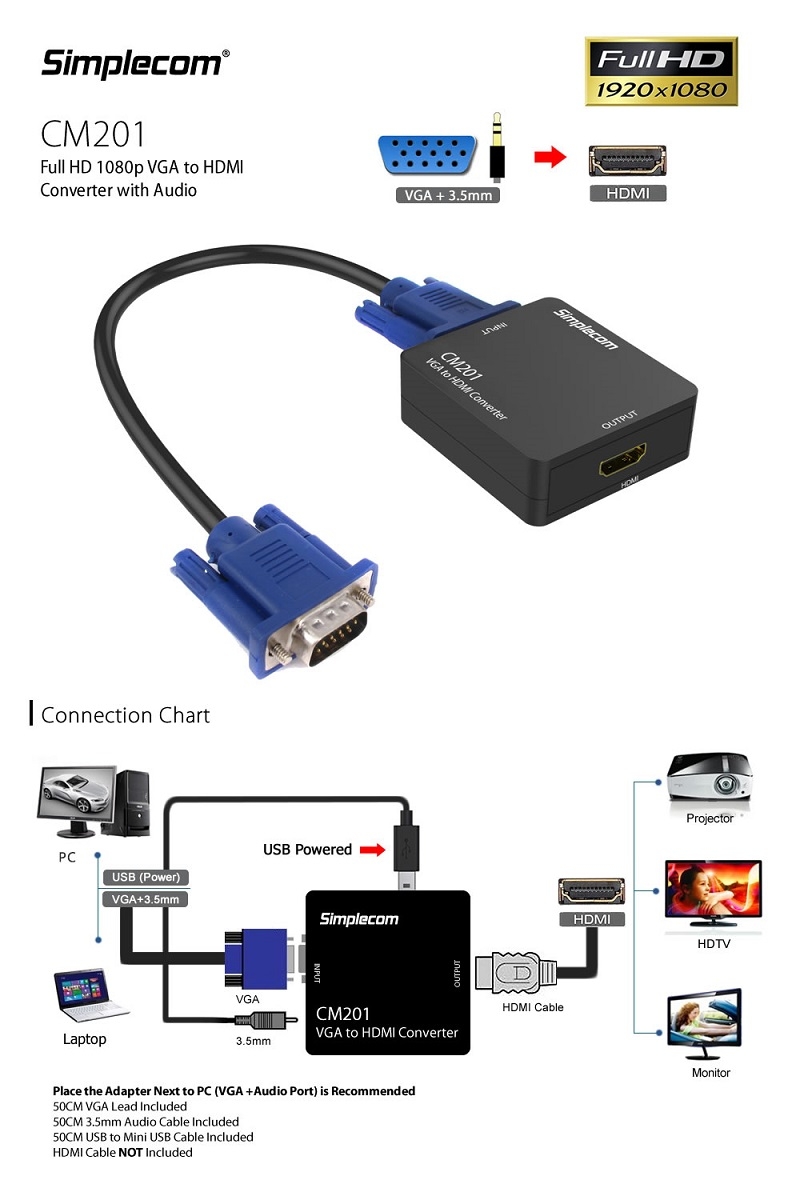 The Simplecom CM201 Full HD 1080p VGA to HDMI Converter with Audio features a VGA to HDMI adapter offers you a convenient way to connect PCs, Laptops with VGA to displays such as Projectors, Monitors, and HDTVs with HDMI, The converter will take audio from the 3.5mm audio input and is powered by USB, plug into either a USB wall adapter or a nearby USB port on PC or TV. Support HDMI digital output with resolutions up to 1080p Simple installation, plug & play Compatible with HDMI version 1.3