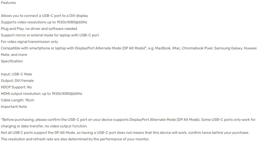 This USB-C to DVI Adapter is specifically designed to connect computers to existing DVI monitors and projectors. It’s great for conferences, presentation, watching video, and more, that you can enjoy on a large display. Plug and play and easy to use, this lightweight adapter can be carried easily in a laptop sleeve.