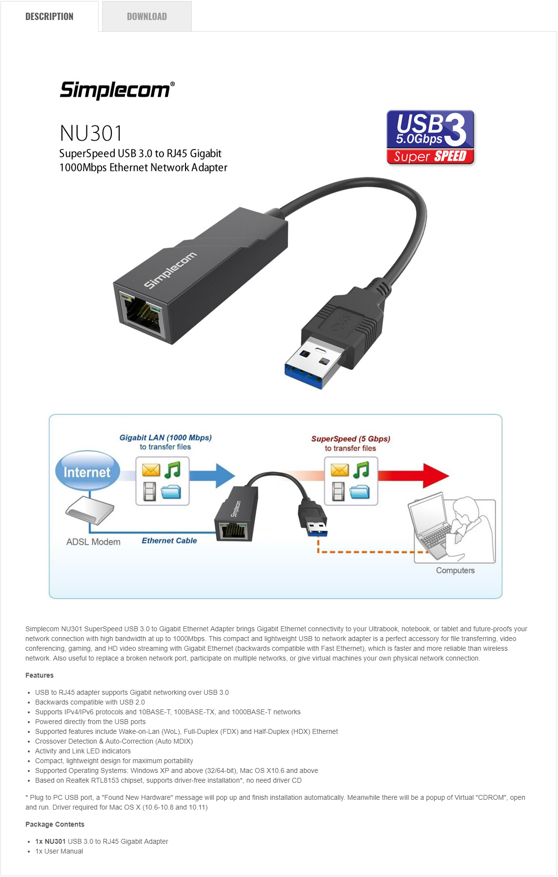 Simplecom NU301 SuperSpeed USB 3.0 to RJ45 Gigabit 1000Mbps Ethernet Network Adapter