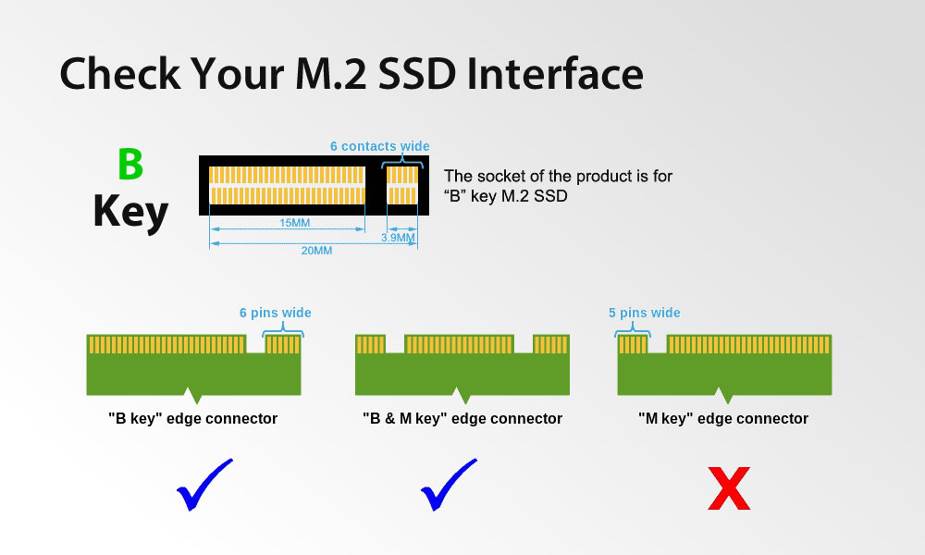 Please Check Your M.2 SSD is SATA Channel or PCI-E Channel on manufacture website before ordering. It supports M.2 NGFF(SATA) B key and B+M Key SSD, M Key only or NVMe M.2 SSD are not supported.