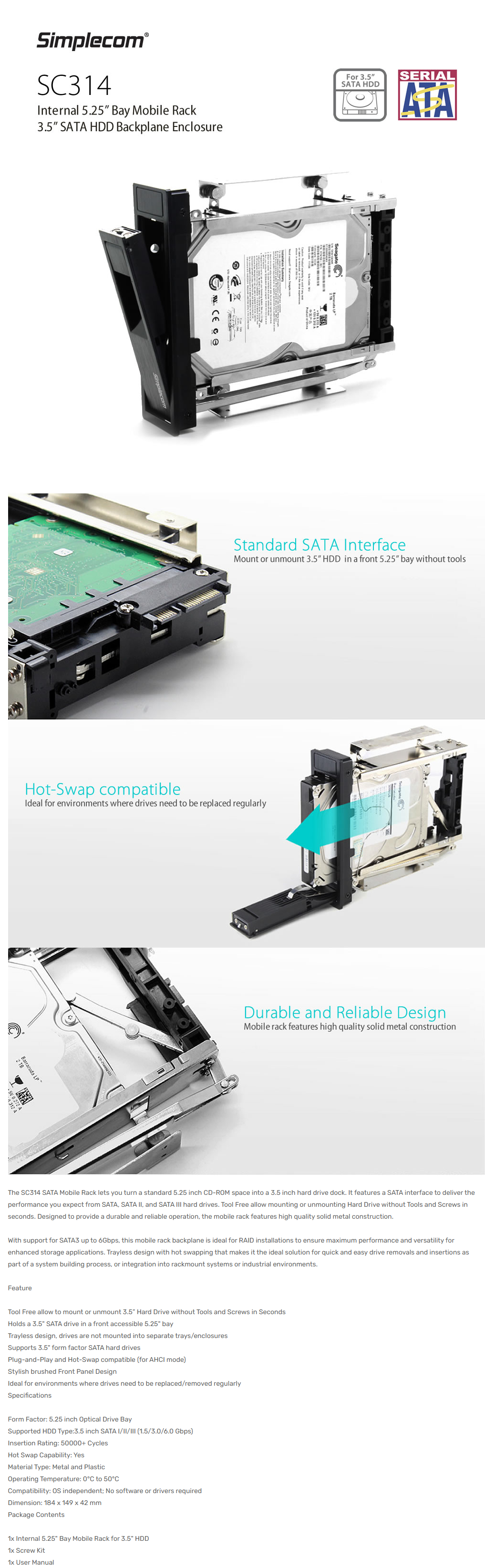 You're reviewing:Simplecom SC314 Internal 5.25" Bay Mobile Rack 3.5" SATA HDD Backplane Enclosure - SC314
