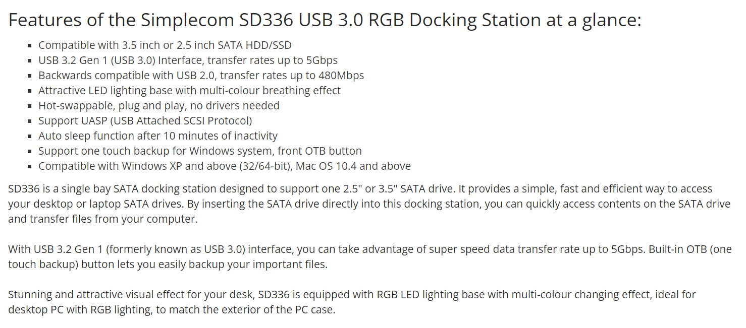 The Simplecom SD336 USB 3.0 2.5 / 3.5in RGB Docking Station supports a single 2.5" or 3.5" drive and offers a fast and stylish way to access your SATA drives from a desktop and laptop, using a USB 3.0 port (backwards compatible with USB 2.0). Equipped with RGB lighting base with multi-colour changing effects, hot-swappable, plug and play, 10-minute auto sleep function, and one touch backup function. Compatible with Windows XP and above, and Mac OS 10.4 and above.